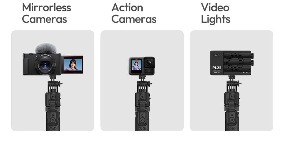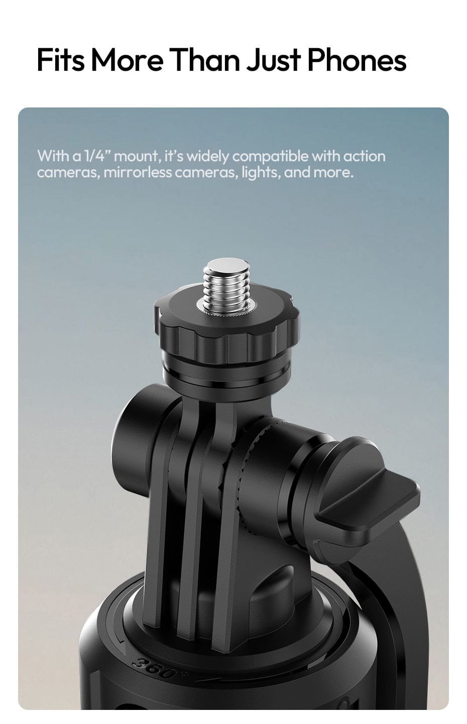 Detachable Phone Clamp + 1/4″ Mount: Phone clamp fits devices 6.5‑9.5cm wide (2.56‑3.74 inches). Also features a standard 1/4″ mount – compatible with action cameras, mirrorless cameras, video lights, and more.