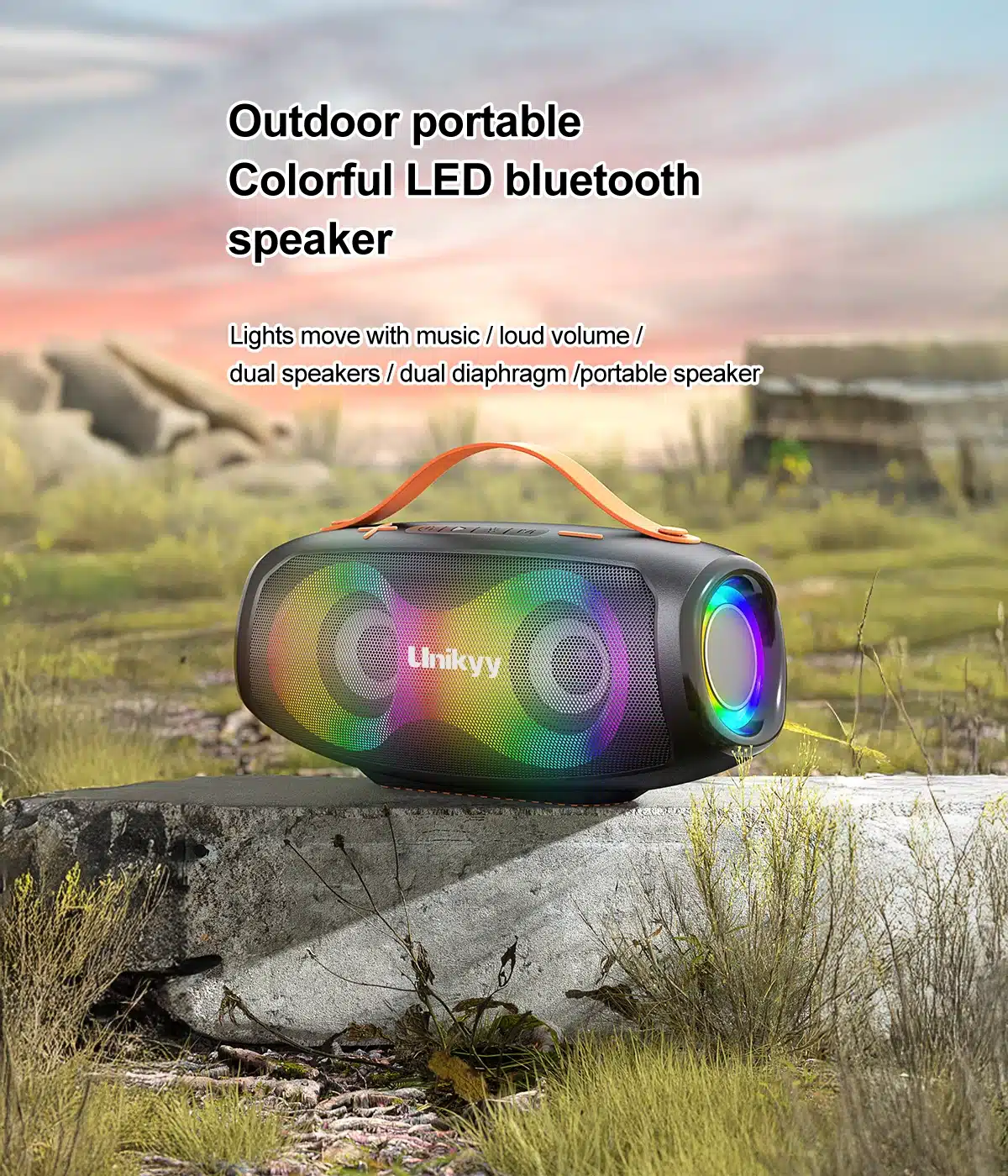 The Unikyy Eagle commands attention with its striking design. Finished in sleek black with a vibrant orange portable handle, this speaker is as stylish as it is functional. The handle is built directly into the frame, making it incredibly easy to grab and go—whether you’re heading to the beach, a backyard barbecue, or a camping trip. The combination of durable plastic and fabric mesh construction ensures the Eagle is both lightweight and tough enough for life on the move. With dimensions of 277*147*148mm and a weight of approximately 1002g, it strikes the perfect balance between portability and powerful performance.