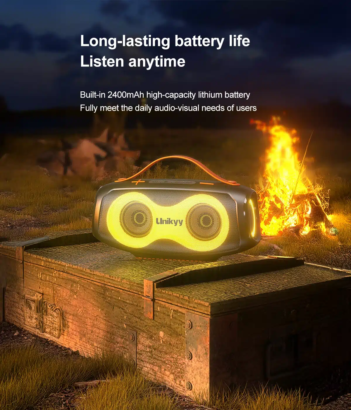 Powered by a reliable internal battery, the Unikyy Eagle delivers approximately 6 hours and 50 minutes of continuous playback at 70% volume. That’s enough juice for a full day of outdoor fun, a long evening gathering, or a road trip playlist. When it’s time to recharge, the convenient Type-C charging port makes powering up fast and easy.