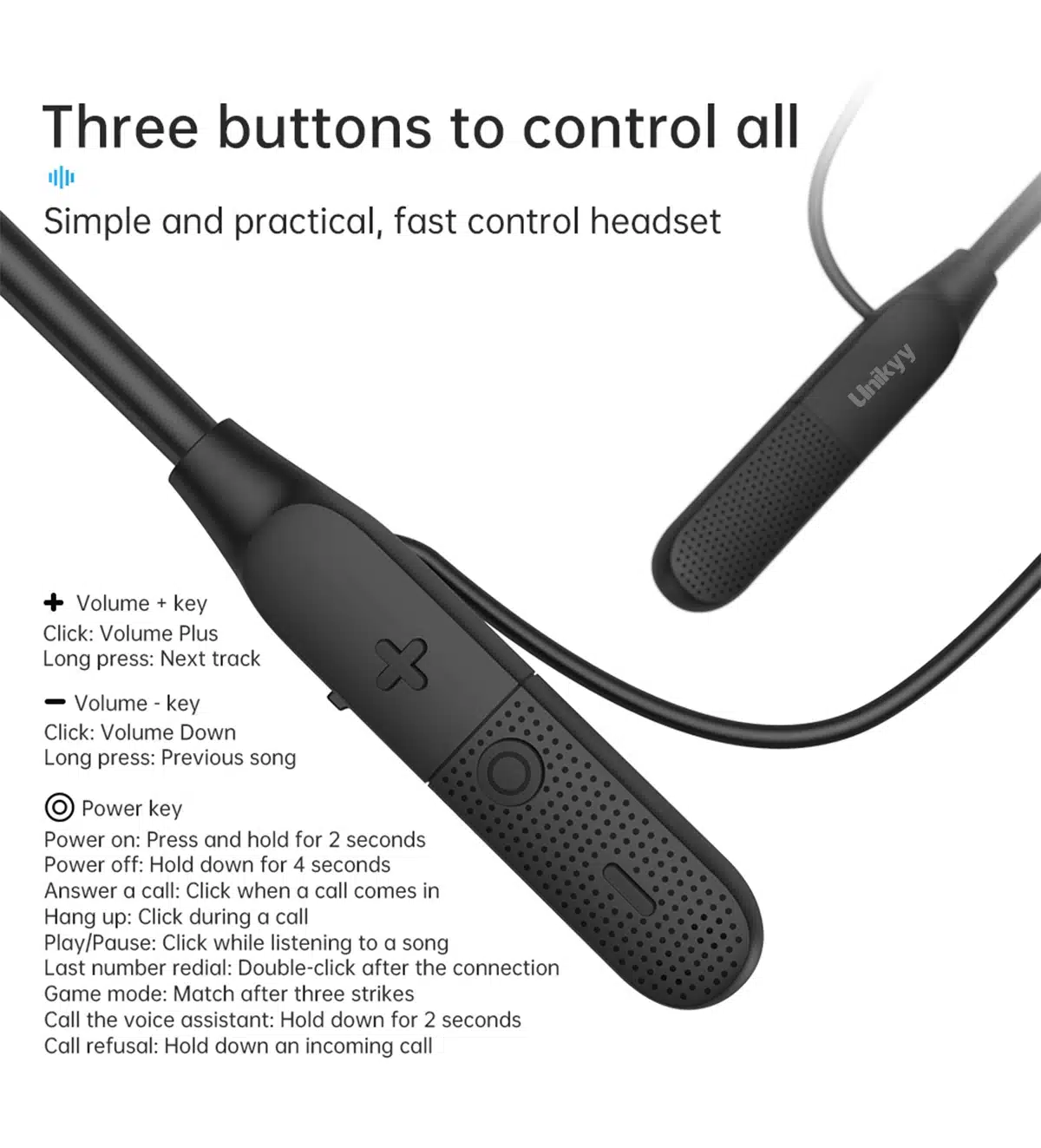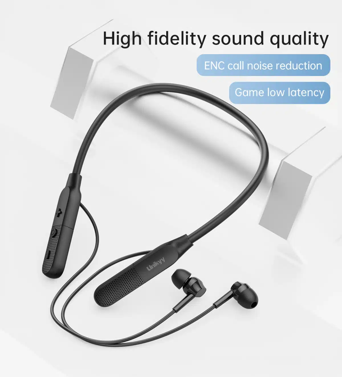 The Unikky Y9 is built around the concept of “wearable comfort.” The neckband is wrapped in a layer of premium, skin-friendly silicone that rests gently against your skin without causing irritation, even during extended use. The earbud wires are made from durable yet soft TPE (Thermoplastic Elastomer) , which is naturally tangle-resistant and flexible, allowing you to move freely throughout your day without the wires getting in the way.
